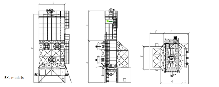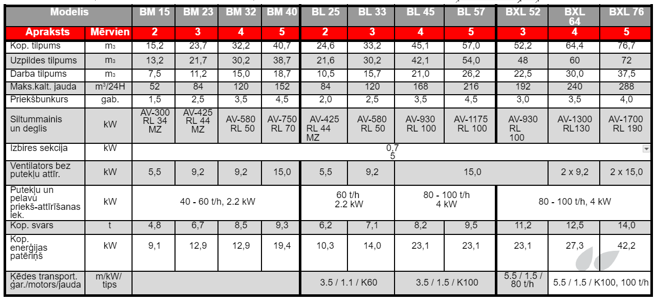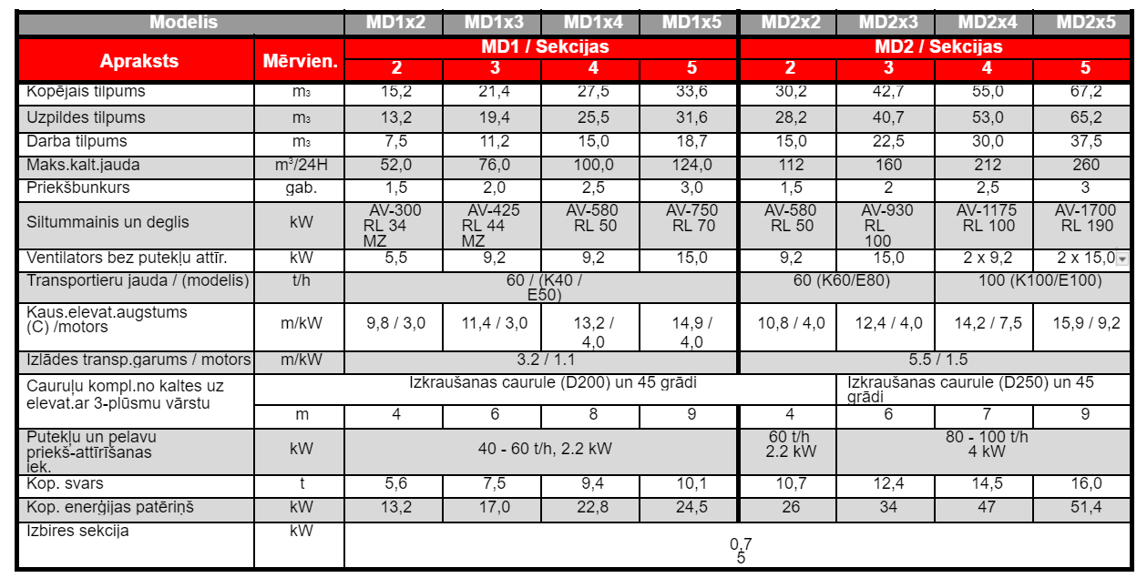 | Modelis/m | A (Karsēšanas zona) | B (Bufera tvertne) | C (Jumta augšdaļa) | D (Kaus.elevat. augša) | E (Siltummainis, gar.) | F (Siltummainis, plat.) | G (Kalte) | H (Kolonna) | I (Ventilators) |