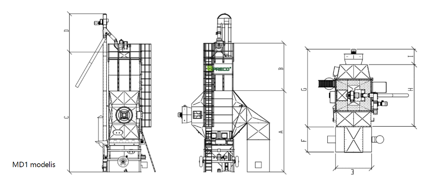 | Modelis/m | A (Karsēšanas zona) | B (Bufera tvertne) | C (Jumta augšdaļa) | D (Platums) | E (Siltummainis, gar.) | F (Siltummainis, plat.) | G (Kalte) | H (Kolonna) | I (Ventilators) |